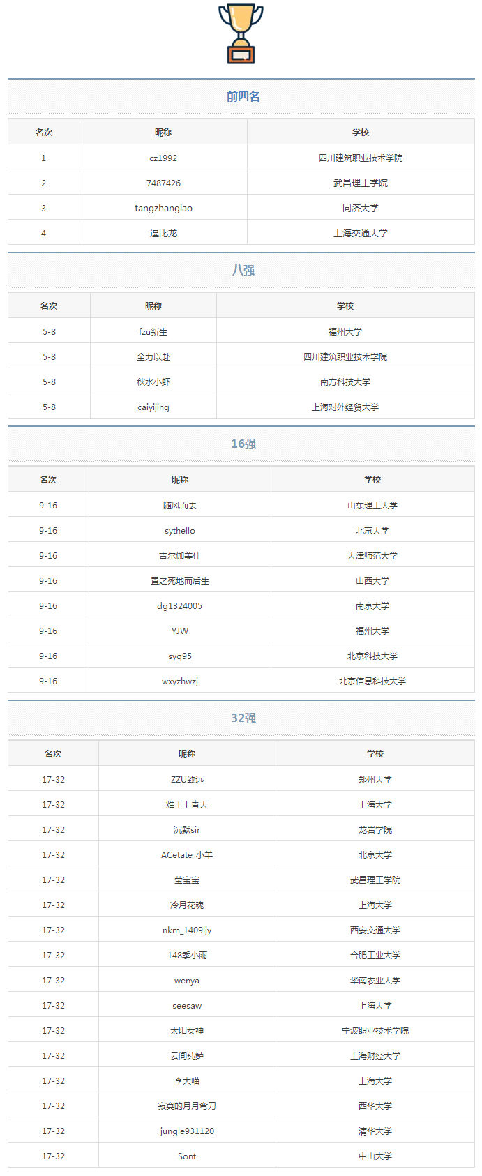 2017全国大学生网络桥牌个人赛圆满结束了,共有来自182个学校的903人参加了比赛。比赛分为两个阶段,第一阶段为10轮积分编排赛,第二阶段为7轮单败淘汰赛。本次比赛对个人总成绩前32名提供证书奖励,恭喜以下获奖的同学们!