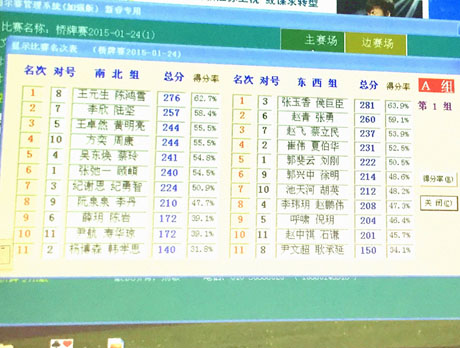 本次活动有44名会员到场参加,比赛方式为米切尔双人赛。按得分率排定名次。经过22副牌的对抗后比赛成绩最终产生。南北组和东西组的冠军分别为:王元生/陈鸿雪、张玉香/侯巨臣;南北组和东西组的亚军分别为李欣/陆坚、赵青/张勇;南北组和东西组季军分别为王卓然/黄明亮/、赵飞/蔡立民。赛后新睿公司为冠军成员颁发了精心准备的纪念品。