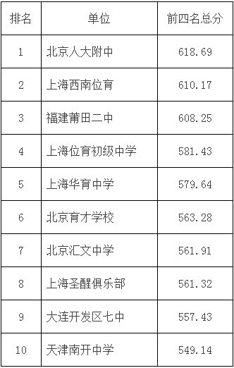 除了个人奖项以外,比赛还设置了两个团队奖项。第一个团队奖项是团队优胜奖。团队优胜奖的评奖方式是累计一个学校参赛选手中成绩前四名的VP作为该学校的成绩。此奖项是对一个学校桥牌综合实力的全面衡量。报名超过4人的学校共有31所。最后,北京人大附中获得第一名,上海西南位育获得第二名,福建莆田二中获得第三名。获得前十名的学校分别是:
