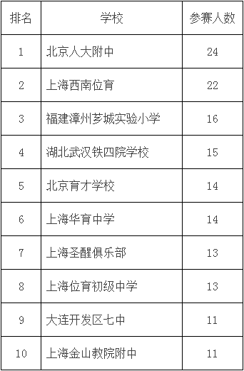 第二个团队奖项是团队风采奖,奖励完成比赛人数最多的学校。比赛一共12轮,每天一轮,能自始至终完成比赛的选手对桥牌一定有着浓厚的兴趣。这个奖项从某种程度上反应了一个学校桥牌的普及程度。在这个奖项中,北京人大附中获得第一名,上海西南位育获得第二名,福建漳州芗城实验小学获得第三名。获得前十名的学校分别是: