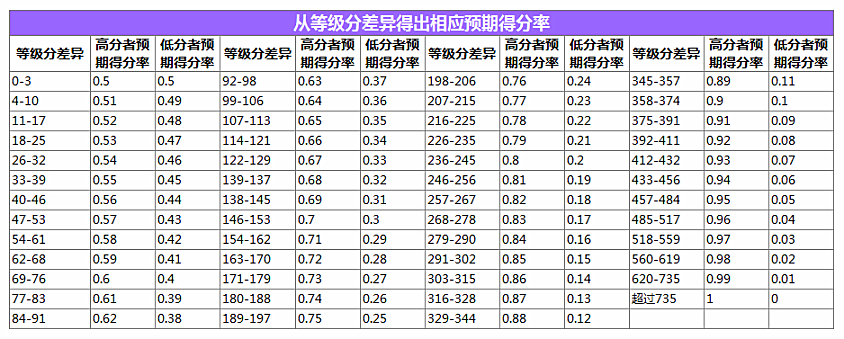 R1是本人的等级分,R2是对手的等级分。当同对手平分时,期望值是0.5,对手等级分越高,期望值越小,获胜得分越多;对手等级分越低,期望值越大,获胜得分越少。