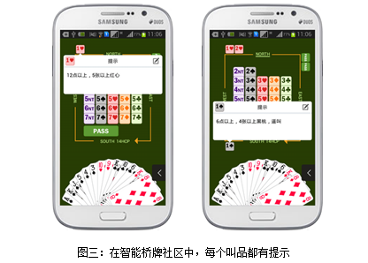 以智能桥牌为基础,通过移动互联网技术构建的社区称为智能桥牌社区。在智能桥牌社区中,桥牌爱好者在叫牌的时候,系统会提示每个叫品的含义。有了叫品提示,学生们可以在打牌的过程中,通过查询叫品的含义,选择合适的叫品进行叫牌。实践证明,很多学生在这个过程中潜移默化地掌握了一个叫牌系统。