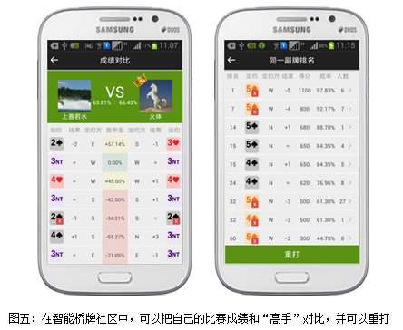在比赛结束后,每个用户可以把自己的成绩和“高手”对比,并且可以回放“高手”的叫牌记录和打牌记录。社区提供的重打功能使用户重新叫牌和打牌,反复练习。
