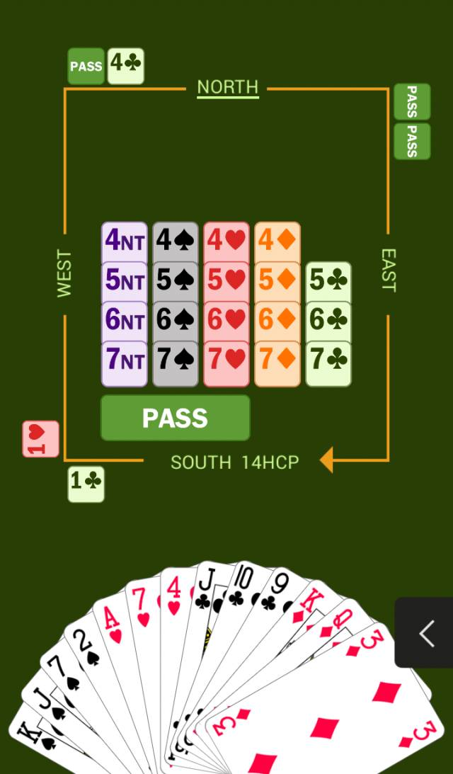 1、1C还是1D? 14点,4-3-3-3平均牌型,第三家开叫,草花J109,方块KQ3,都是三张,但方块牌力更强,似乎有理由选择1D,不过回忆一下CCBA叫牌约定卡,低花33果断选择1C!。